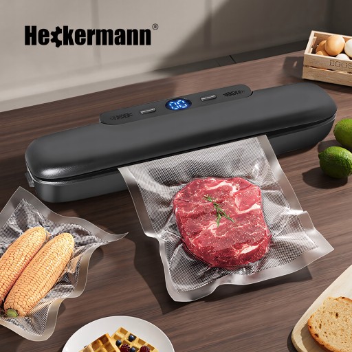 Zgrzewarka próżniowa Heckermann to nowoczesne urządzenie do pakowania żywności, które dzięki jednoprzyciskowej automatycznej obsłudze zapewnia wygodę i szybkość działania.