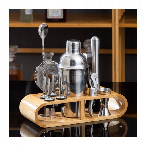 Zestaw do wytrząsania koktajli ma doskonały efekt lustra i wyjątkowy bambusowy stojak, to najlepszy wybór dla osób, które lubią mieszać składniki.