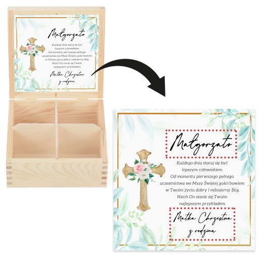 ➡️ Jeśli szukasz unikalnego upominku, to pudełko jest idealnym wyborem. To świetny pomysł na prezent z okazji Pierwszej Komunii Świętej dla osób, które pragną podarować coś unikatowego, osobistego i pamiątkowego, jednocześnie zachowując element praktyczny.