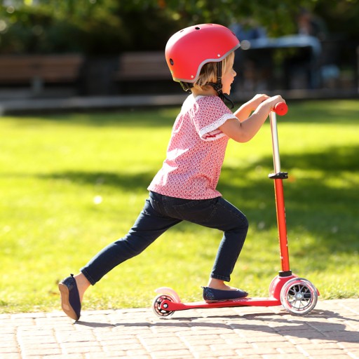 Nauka – trójkołowa konstrukcja Mini Micro ułatwią naukę jazdy na hulajnodze. Maluch czuje się pewnie i szybciej „załapuje” technikę jazdy. Mini Micro została wyposażona w specjalny, opatentowany mechanizm, który ułatwia skręcanie. Aby wykonać taki manewr wystarczy balansować ciałem i leciutko pochylić drążek kierownicy.