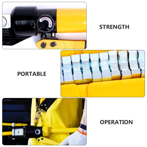 Ten produkt to zestaw narzędzi do zaciskania, który jest używany do zaciskania i łączenia drutów aluminiowych, miedzianych i kabli w zastosowaniach morskich i architektonicznych. Doskonałe do łączenia i zaciskania z siłą trzymającą. Narzędzie jest bezpieczne i nie rozrywa kabli ani przewodów podczas zaciskania.