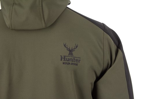 Kurtka posiada hafty z logo "HUNTER" na lewej piersi oraz na karczku w kolorze czarnym oraz na prawym rękawie w kolorze oliwkowym.