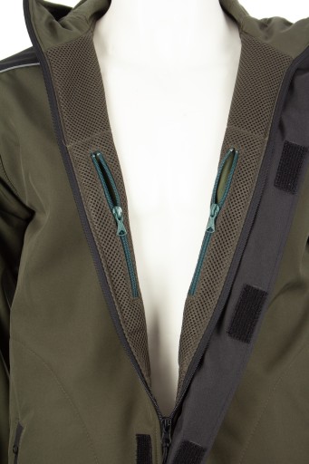 Zapinana jest na długości na zamek kryty patką na rzepy.Wzdłuż rękawów znajdują się odblaskowe wypustki.