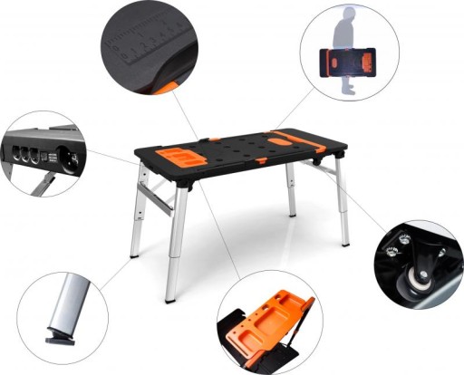 Posiada dużą powierzchnię roboczą dzięki której piłowanie i wiercenie jest prostsze. Z boku znajduję się wbudowane gniazdko do zasilania.