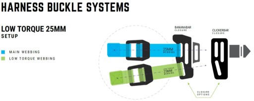 2 taśmy o szerokości 25mm, górna-główna odpowiadająca za dociąganie haka i dolna wszyta pod odpowiednim kątem, tak aby utrzymywać hak komfortowej pozycji i minimalizować podchodzenie haka. Zapewnia to optymalny komfort nawet podczas najbardzie wymagających ewolucji.