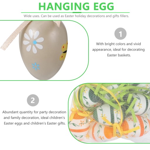 Żywe kolory sprawiają, że te pisanki są pomysłowe i kreatywne, aby dodać więcej atmosfery wielkanocnej. Dzięki wiszącemu projektowi można go łatwo zawiesić na choinkach wielkanocnych, drzwiach i oknach, światłach upuszczanych, kominkach itp. Wykonane z tworzywa sztucznego, bezpieczne i wielokrotnego użytku.