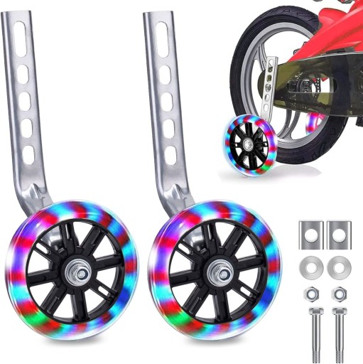 - Kółka treningowe będą świecić podczas jazdy, dzięki czemu Twoje dzieci będą bardziej widoczne i bezpieczniejsze w nocy lub w ciemności. Fajny, świecący design sprawi, że dzieci zainteresują się nauką jazdy na rowerze.