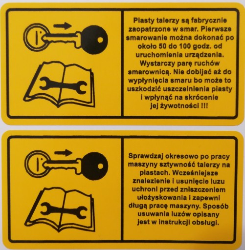Naklejki są wykonane z żółtej folii samoprzylepnej. Doskonale sprawdzą się na maszynach rolniczych typu agregat i innych urządzeniach.