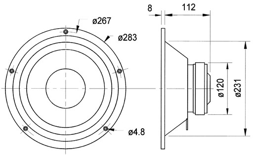 25-centymetrowy głośnik niskotonowy Hi-Fi z silnym układem wzbudzającym, głęboko wciągniętą płytą biegunową i 38-milimetrową cewką dźwiękową odznacza się wysoką mocą skuteczną. Elastyczne gumowe obramowanie, osłonięta papierowa membrana i otwór regulujący ciśnienie.