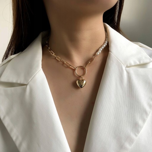 Cecha: Asymetryczna mozaika pereł i metalowych łańcuszków oraz zawieszka miłosna tworzą niepowtarzalny styl.