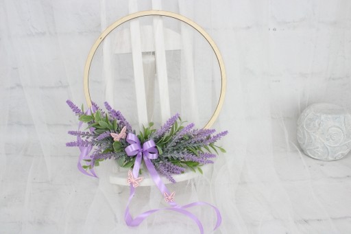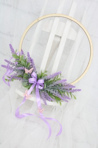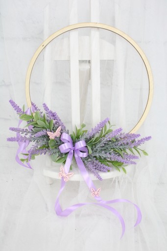 Udekorowana naturalnie wyglądającymi sztucznymi kwiatami lawendy, dekoracyjnymi gałązkami trzykrotki, tasiemkami oraz drewnianymi motylkami. Idealnie wpisująca się w obecne trendy.
