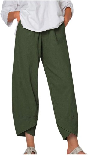 Zielone spodnie o prostym fasonie, w pasie gumka