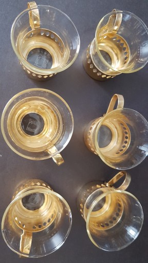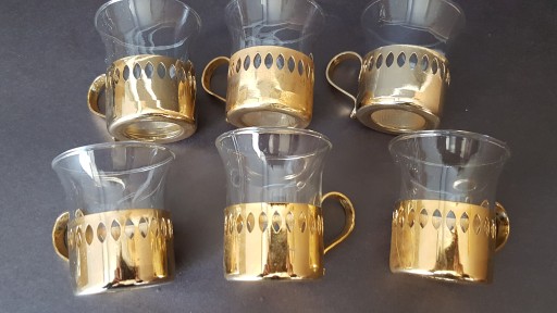 Komplet 6 sztuk szklaneczki Jena Glas Schott Maintz w złotych metalowych koszyczkach.