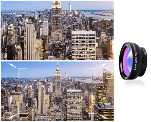 Apexel APL-0.45WM to kombinowany obiektyw do telefonu składający się z makroobiektywu i szerokokątnego obiektywu o jakości HD. Do produkcji tego akcesorium wykorzystuje się optyczne szkło o wysokiej przepuszczalności światła i powłoce zapobiegającej pojawianiu się niepożądanych odblasków. Aluminium obudowy zwiększa trwałość i odporność na zużycie obiektywu.