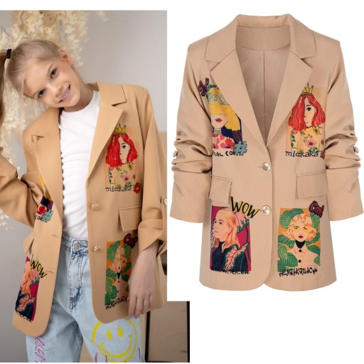 Жакет оверсайз для девочки бежевый латте, свободный с аппликациями 140