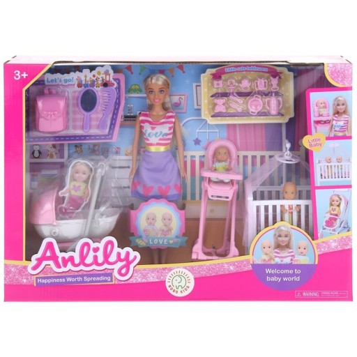 LALKA ANLILY ZESTAW Z DZIEĆMI I WÓZKIEM MEBLE ŁÓŻECZKO AKCESORIA + 2 BOBASY