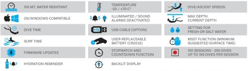 - Główne informacje są umieszczone na jednym ekranie i są widoczne na pierwszy rzut oka: prędkość nurkowania i wynurzania, temperatura, czas nurkowania i czas na powierzchni oraz głębokość.