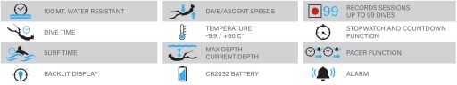 Główne informacje są widoczne na tym samym ekranie i widoczne na pierwszy rzut oka: prędkość nurkowania i wynurzania, temperatura, czas nurkowania i czas na powierzchni, głębokość.