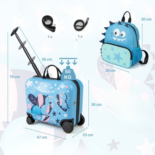 Walizka z plecakiem podróżnym utrzymana jest w przyjemnej stylistyce ze smokami. Oba elementy zestawu mają wytrzymałą warstwę zewnętrzną, skutecznie chroniącą zawartość. W walizce i plecaczku znajdzie się mnóstwo miejsca na dziecięce ubrania, książki, zabawki i wiele innych. Zestaw bagażowy wykonany jest z wysokiej jakości tworzywa ABS i PC z wodoodporną folią matową, która jest przystosowana do użytku zewnętrznego i skutecznie zapobiega zarysowaniom. Teleskopowa rączka o regulowanej wysokości i regulowane paski na ramię spełniają potrzeby dzieci o różnym wzroście. Dzięki czterem dużym kółkom obrotowym 360° bagaż podręczny jest łatwy do przemieszczania.