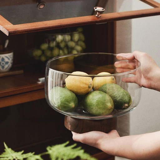 JAPOŃSKI: Japońska miska na owoce na wysokiej nóżce, o unikalnym kształcie, z materiału, z piękną drewnianą podstawą, słoje drewna są delikatne, co zapewnia stabilność i piękno.