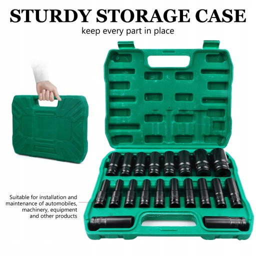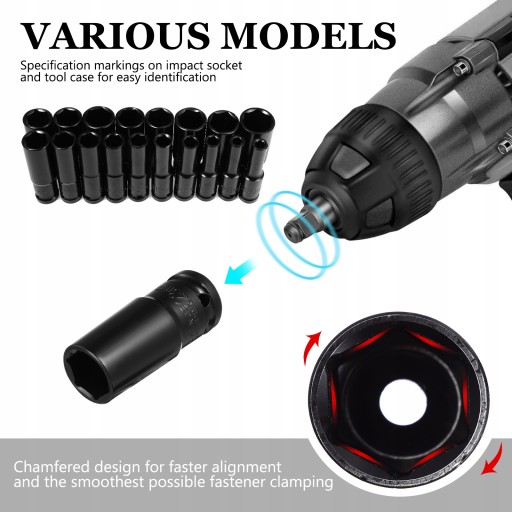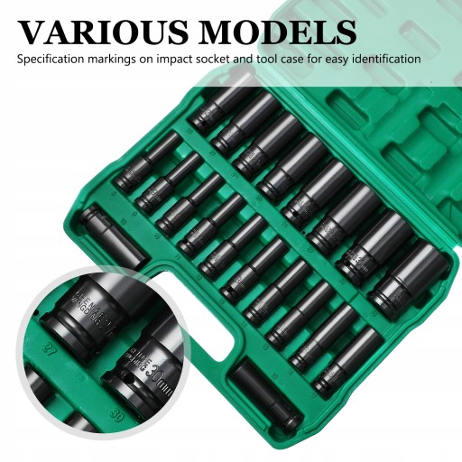 ⭐Czy nadal szukasz praktycznego zestawu nasadek udarowych? Jeśli tak, ten produkt może być dla Ciebie najlepszą opcją. Jest to zestaw narzędzi nasadowych udarowych 1/2 z oznaczeniami specyfikacji. Nie jest łatwo złamać i odkształcić się przez dłuższy czas użytkowania. Dzięki wielu specyfikacjom produkt ten może spełnić Twoje różne potrzeby użytkowania.