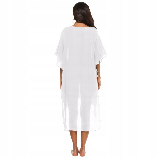 TUNIKA PLAŻĘ ZWIEWNA LUŹNA NARZUTKA PAREO BOHO Materiał: poliester Rozmiar uniwersalny: biust: 125 cm talia: 130 cm długość przód: 85-116 cm rękaw: 19 cm