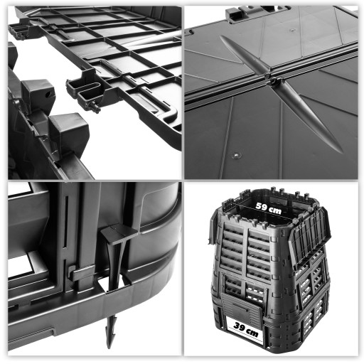 Pojemnik posiada otwory wentylacyjne w ścianach bocznych gwarantujące odpowiednią cyrkulację powietrza oraz otwór wlewowy w klapie umożliwiający nawadnianie kompostu.
