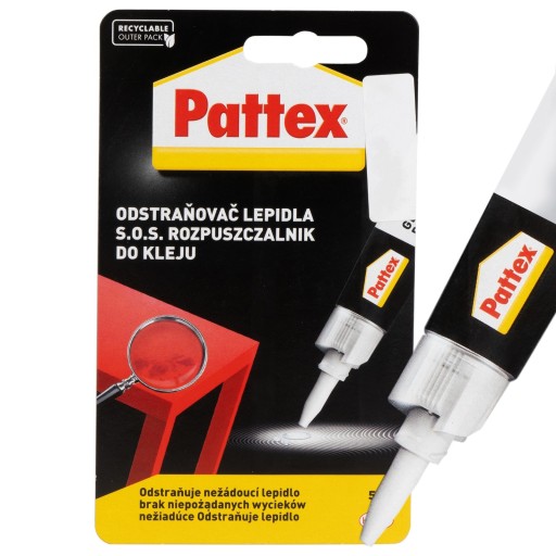 Pattex S.O.S. Rozpuszczalnik do kleju jest jednoskładnikowym rozpuszczalnikiem do usuwania zabrudzeń po klejach błyskawicznych (cyjanoakrylowych).