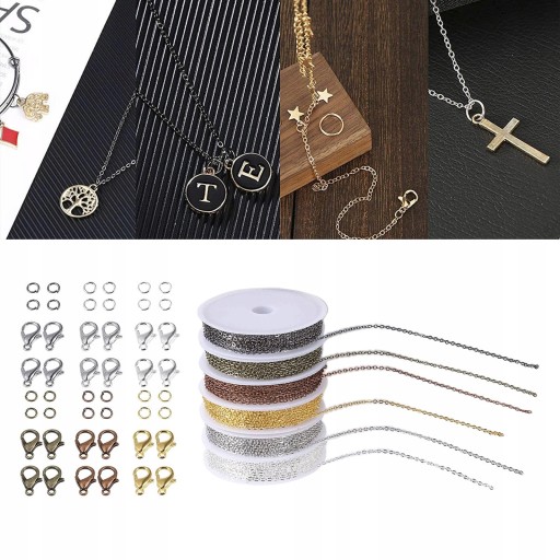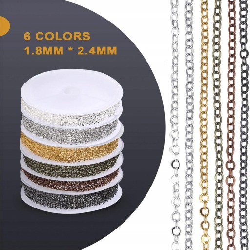 Kolor i rozmiar: brąz, czerwona miedź, czarny, złoty, srebrny, biały srebrny, 6 różnych kolorów, aby sprostać różnym codziennym kolokacji DIY; łańcuszek ogniwowy 9,8 stopy na rolkę, rozmiar pierścieni skokowych: 5 mm, zapięcia homara rozmiar: 7 x 12 mm