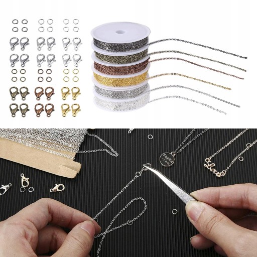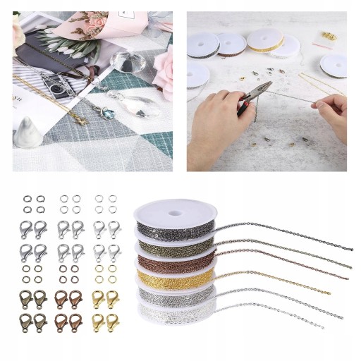 Pakiet zawiera: 6 kolorów naszyjnik z łańcuszkiem, 9,8 stopy na rolkę, łącznie 59 stóp; 6 kolorów pierścieni do otwartego skoku, 30 na kolor, łącznie 180; 6 kolorów zapięć homara, 10 na kolor, łącznie 60