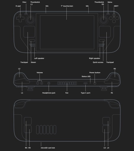 Kontrola i komfort: Steam Deck został zbudowany z myślą o dłuższych sesjach grania - niezależnie od tego, czy sterujesz grą za pomocą kciuków, czy panelu dotykowego - z pełnowymiarowymi elementami sterującymi umieszczonymi idealnie w zasięgu ręki. Tylna część urządzenia została wyprofilowana tak, by wygodnie pasowała do wielu rozmiarów dłoni.