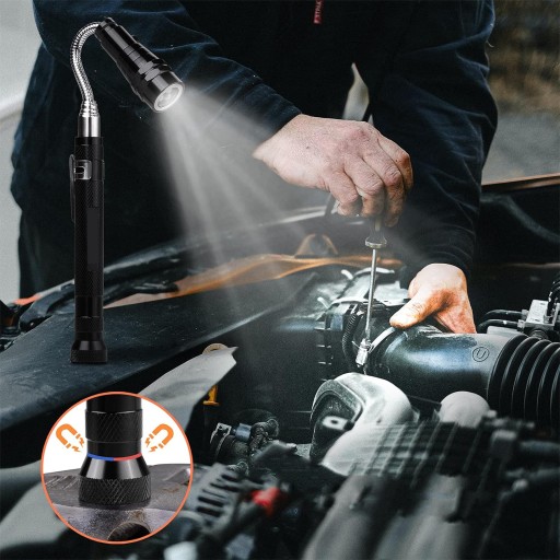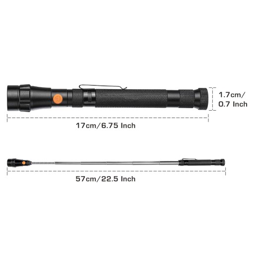 🧲 【6 elementów teleskopowych】 Elastyczna latarka ze stabilną i lekką obudową aluminiową można przedłużyć od 17 cm do 57 cm. Obracana o 360 stopni łabędzia szyja umożliwia elastyczne ustawienie obszaru oświetlenia.