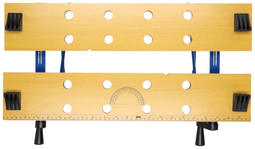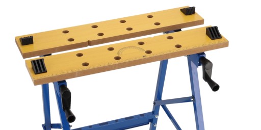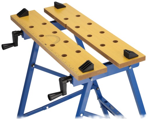 Niezależna regulacja obu części blatu pozwala na przymocowanie przedmiotów o nierównej płaszczyźnie. Stół roboczy wykonany jest z płyty MDF.