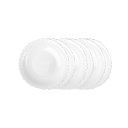 Komplet 6 talerzy deserowych o średnicy 19 cm, wykonane z białego szkła hartowanego, tzw. szkła opalowego. Talerze w klasycznym, okrągłym kształcie, elegancko zdobione subtelnymi, karbowanymi tłoczeniami przy krawędzi a dodatkowym ich atutem jest ozdobny, falowany brzeg.