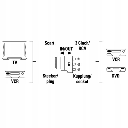 Umożliwia przesyłanie sygnału audio / wideo ze złączy Cinch RCA w kierunku złącza EURO SCART (lub w odwrotnym kierunku) w celu podłączenia urządzeń audio takich jak kamera, magnetowid, DVD i innych z telewizorem.