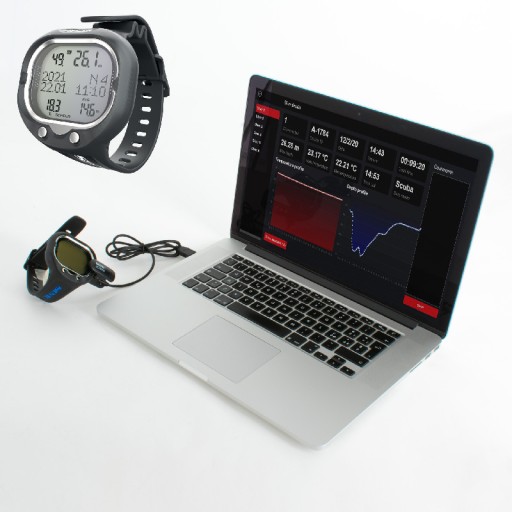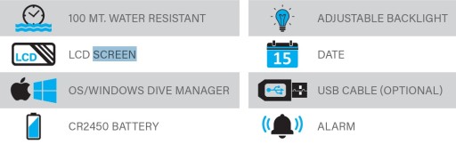 - Dodatkowe informacje: maksymalna głębokość 100 metrów, obliczanie czasów NoFly i Desaturacji, ostrzeżenie o maksymalnej dozwolonej wysokości, wybór słodkiej lub słonej wody.