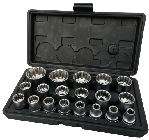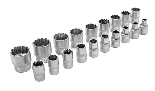 Komplet 19 nasadek SPLINE wykonany z wytrzymałej stali chromowo-wanadowej, dzięki czemu są odporne na uszkodzenia mechaniczne, zużycie, korozję, rozciąganie.
