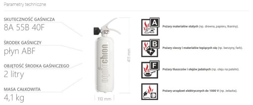 Gaśnica proszkowa 2 kg ABC z głowicą plastikową, manometrem i wieszakiem Gaśnica proszkowa przeznaczona do samochodów osobowych . Stanowi podstawowe zabezpieczenie Twojego auta . Optymalna wielkość gaśnicy (3,4 kg), uniwersalność środka gaśniczego (2 kg proszku ABC) oraz prostota działania umożliwiają użycie urządzenia przez osoby dorosłe bez specjalnego przeszkolenia. Cechuję się większą skutecznością gaśniczą niż standardowe 1 kg gaśnice samochodowe. Cechy: Łatwa i ergonomiczna w obsłudze. Szybka i skuteczna w gaszeniu. Ekonomiczna w utrzymaniu i obsłudze serwisowej. Sposób użycia 1. Wyrwij zabezpieczenie ? zawleczkę. Pozwoli to na odblokowanie gaśnicy. 2. Skieruj końcówkę wylotową na źródło ognia. Nie należy celować w płomienie. 3. Naciśnij dźwignię spustową, aby uwolnić środek gaśniczy. 4. Omiataj strumieniem środka gaśniczego źródło ognia dopóki ogień nie zgaśnie. Trzymaj gaśnicę pionowo. W skład zestawu wchodzą: ? Gaśnica proszkowa (2 kg). ? Wieszak tworzywowy. Oznaczenia literowe środków gaśniczych stosowane w Europie: A ? do gaszenia pożarów ciał stałych, które paląc się nie tylko powodują płomień, ale także ulegają rozżarzeniu np. drewna, papieru, gumy, B ? do gaszenia pożarów cieczy i ciał stałych, które paląc się ulegają stopieniu np. benzyny, polietylenu, smoły, C ? do gaszenia pożarów gazów palnych np. metanu, acetylenu, propanu. DANE TECHNICZNE Skuteczność gaszenia:13A 89B C Masa środka gaśniczego:2 kg Czynnik roboczy:N2 Czas działania:min. 9 s Ciśnienie próbne:27 bar Ciśnienie robocze:12 bar Zakres temperatur stosowania:-30 °C / +60 °C Masa całkowita:~3,4 kg Maks. napięcie gaszonego urządz.:1000 V Całkowita wysokość:345 mm Średnica zbiornika:110 mm PODSTAWOWE CECHY ? Łatwa i ergonomiczna w obsłudze. ? Szybka i skuteczna w gaszeniu. ? Ekonomiczna w utrzymaniu i obsłudze serwisowej. ? Zawór odcinający za wskaźnikiem ciśnienia ułatwia kontrolę gaśnicy. ? Konstrukcja zaworu umożliwia czasowe przerwanie gaszenia. ? Zbiornik gaśnicy nie podlega kontrolnym badaniom UDT. ? Możliwość wielokrotnego napełniania. ? Zbiornik gaśnicy pokryty farbą poliestrową odporną na promienie UV.