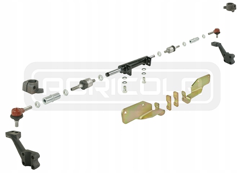 Siłownik poprzeczny z tłoczyskiem wysuwanym na dwie strony, w zestawie z mocowaniami, przegubami i ramionami zwrotnicy.