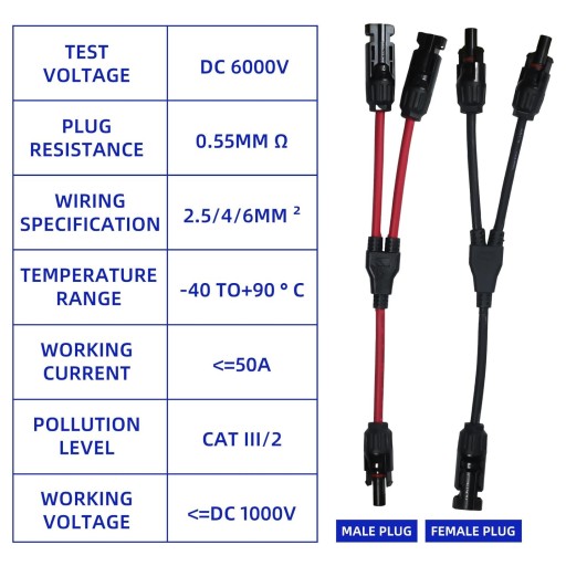 Złącze solarne Y, złącze solarne PV Y Kabel słoneczny 6 mm², wodoodporne, trudnopalne złącze solarne Fotowoltaika z kablem do panelu słonecznego.