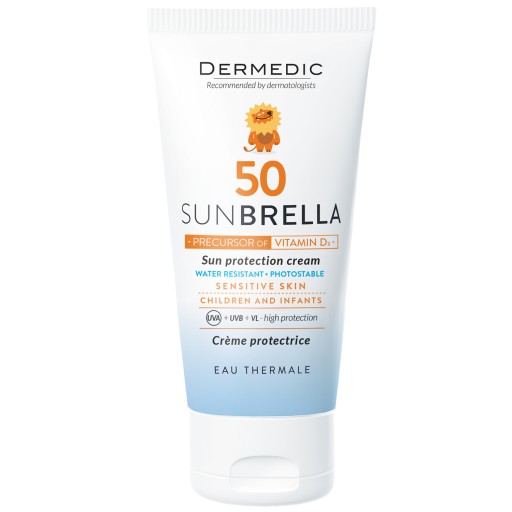 Dermedic Baby Sunbrella krem do twarzy SPF50 to produkt przeznaczony dla dzieci i niemowląt powyżej 1 miesiąca życia i dzieci. Odpowiednio dobrany kompleks filtrów mineralnych zapewnia skuteczną i wysoką ochronę przed promieniowaniem UV (A+B). Zastosowane filtry są bezpieczne dla delikatnej skóry maluchów. Tworzą na jej powierzchni warstwę chroniący przed przenikaniem promieniowania UV. W kremie możemy znaleźć innowacyjny składnik aktywny Aqua-proVita D, który jest prekursorem witaminy D. Pod wpływem promieni UV przekształca się on w witaminę D. Dzięki temu kosmetyk działa łagodząco na podrażnienia, wspiera funkcje barierowe skóry oraz cykl odnowy biologicznej naskórka.