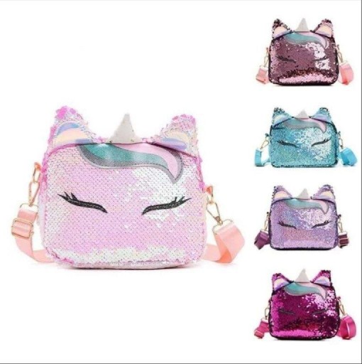 Urocza torba na ramię w kształcie jednorożca. Świetnie się sprawdzi jako użyteczny gadżet dla każdej dziewczynki. Zapinana na suwak, zabezpiecza skarby przed zgubieniem. Regulowany pasek pozwala na wygodne dopasowanie. Super pomysł na atrakcyjny prezent. Zewnętrzna strona torby ozdobiona cekinami.