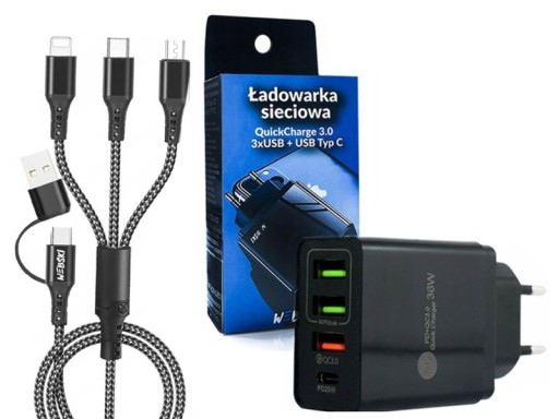 ZASILACZ SIECIOWY DO TELEFONU TABLETU QC 3.0. 3xUSB + PD TYP C Z KABLEM 5W1