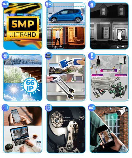 | ✅ Rozdzielczość 5MPx | ✅ Detekcja człowiek/pojazd z powiadomieniami na telefon | ✅ Tryb nocny do 20 metrów(IR) | ✅ Praca kamer wewnątrz/na zewnątrz(IP 66) | ✅ Długi zapis nagrań na dysk w rejestratorze | ✅ Odtwarzanie nagrań/podgląd na żywo przez telefon | ✅ Połączenie 1-przewód - skrętką komputerową.