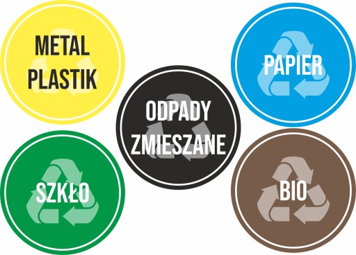 ZESTAW NAKLEJEK NA KOSZE DO SEGREGACJI ŚMIECI 5 szt. 10 x 10 cm CIĘTE PLOTEROWO PO OBRYSIE.
