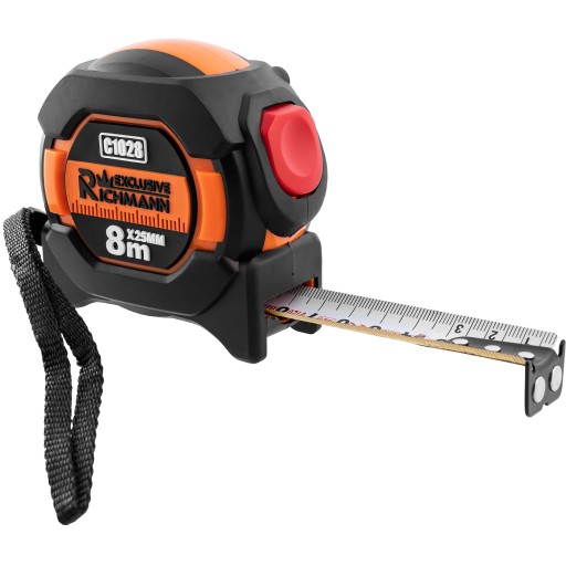 Wysokiej jakości profesjonalna miara zwijana o wymiarach 8 m x 25 mm.Dwustronna taśma (biała/żółta) z I klasą dokładności.Wyposażona w mechanizm automatycznego blokowania „AUTO-STOP” taśmy podczas rozwijania.Wyraźne cyfry oraz dobrze widoczna podziałka.Taśmę możemy zwinąć wciskając specjalny przycisk zwalniający blokadę, umieszczony w czołowym odcinku korpusu.Mechanizm zwijania działa błyskawicznie i płynnie.Na początku taśmy znajdują się mocne magnesy neodymowe, ułatwiające rozpoczęcie pomiaru z metalowych elementów.Zaczep z otworem rozpoczynający pomiar został solidnie przymocowany trzema nitami.Specjalna konstrukcja miarki chroni dłoń przed zranieniem podczas zwijania.Pokryta nylonem zapobiegającym załamaniom oraz ułatwiającym odczyt w słoneczny dzień.Powłoka nylonowa dodatkowo zapobiega powstawaniu korozji czy wycieraniu podziałki.Miara posiada nylonowy pasek na nadgarstek wykonany z mocnego tworzywa.Ergonomiczny kształt pokryty antypoślizgową gumą ABS.Wyposażona w metalowy zaczep do paska.Solidna jakość wykonania gwarantuje długotrwałe użytkowanie.Miarka spełnia wszelkie normy europejskie CE.Jakość premium.