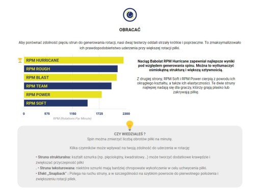 Przedstawiamy RPM POWER ! Podobnie jak oryginalna RPM Blast, ta struna daje dużym uderzającym precyzję niezbędną do atakowania piłki najmocniejszymi uderzeniami. W porównaniu z RPM Blast wykazuje wyższy poziom komfortu i mocy, co czyni tę opcję świetną opcją dla gracza, który lubi prowadzić piłkę po korcie. Chociaż nie jest tak przyjazny dla rotacji jak RPM Blast, sprawdza się wyjątkowo dobrze dla tych, którzy lubią prowadzić piłkę przez kort. Podsumowując, jest to bardzo imponujący dodatek do kultowej serii RPM firmy Babolat.