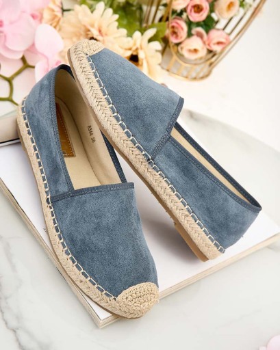 Wyjątkowe damskie espadryle wykonane z eko skóry zamszowej i tkaninowej wkładki. Płaska podeszwa zdobiona sznurkiem jutowym zapewnia wygodę. Model wsuwany. Doskonały dodatek do letnich stylówek!