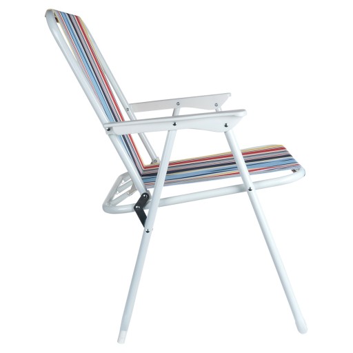 ✅ WYTRZYMAŁY - Krzesła są wykonane z wytrzymałych i solidnych materiałów. Poszycie wykonane z wytrzymałej tkaniny poliestrowej w kolorowe pasy. Stelaż krzeseł wykonany jest z metalu w białym kolorze, a podłokietniki wykonane z tworzywa w kolorze białym. Blat stolika wykonany z wysokiej jakości płyty MDF w jasnobrązowym kolorze - swoim wyglądem imituje drewno. Blat został zabezpieczony specjalną, odporną powłoką. Obręcz blatu została wykonana z aluminium w srebrnym kolorze. Składany stelaż został wykonany z wysokiej jakości metalu w kolorze białym.
