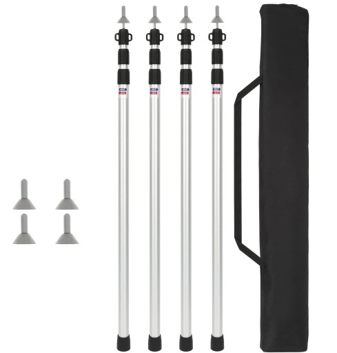 Regulowane tyczki do przedsionków można regulować w zakresie od 35,4 cala (90 cm) do 90,5 cala (230 cm), aby uzyskać odpowiednią wysokość do przedsionków namiotowych, dużych plandek lub tymczasowych schronień budowlanych. Teleskopowy drążek umożliwia przenoszenie kompaktowej, łatwej do przenoszenia torby z zamkiem błyskawicznym od pojedynczego obozu do obozu rodzinnego. Doskonały na kempingi samochodowe i motocyklowe.
